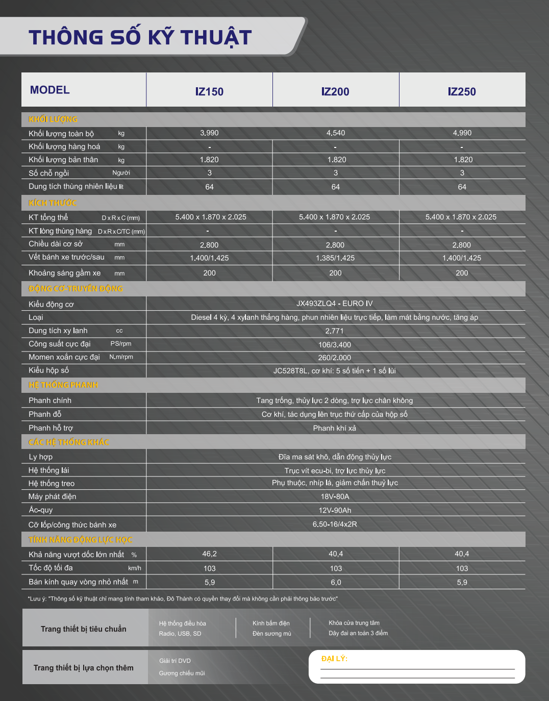 THÔNG SỐ DOTHANH IZ200 1.9 TẤN: