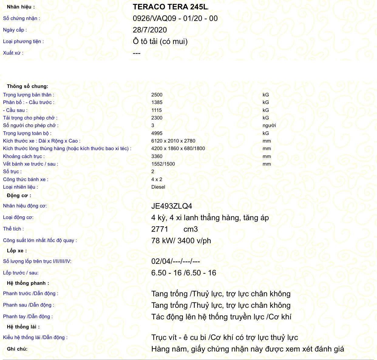 THÔNG SỐ XE TERA245L