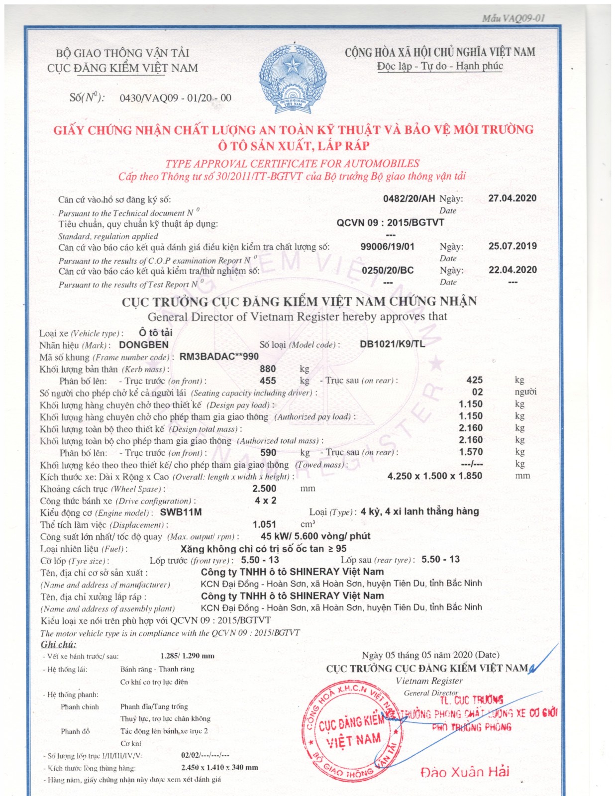 THÔNG SỐ DONGBEN 2020 1150KG:
